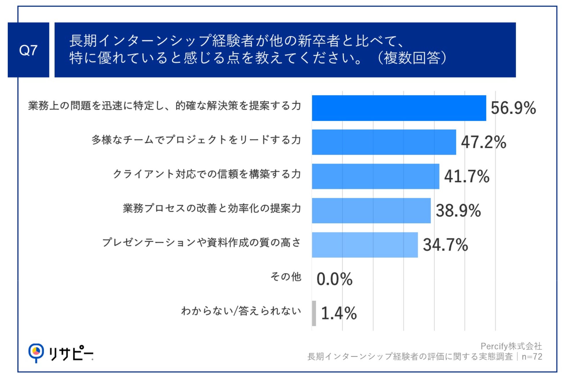 Q6で「非常に感じる」「やや感じる」と回答した方に、「Q7.長期インターンシップ経験者が他の新卒者と比べて、特に優れていると感じる点を教えてください。(複数回答)」(n=72)と質問したところ、「業務上の問題を迅速に特定し、的確な解決策を提案する力」が56.9%、「多様なチームでプロジェクトをリードする力」が47.2%、「クライアント対応での信頼を構築する力」が41.7%という回答となりました。
