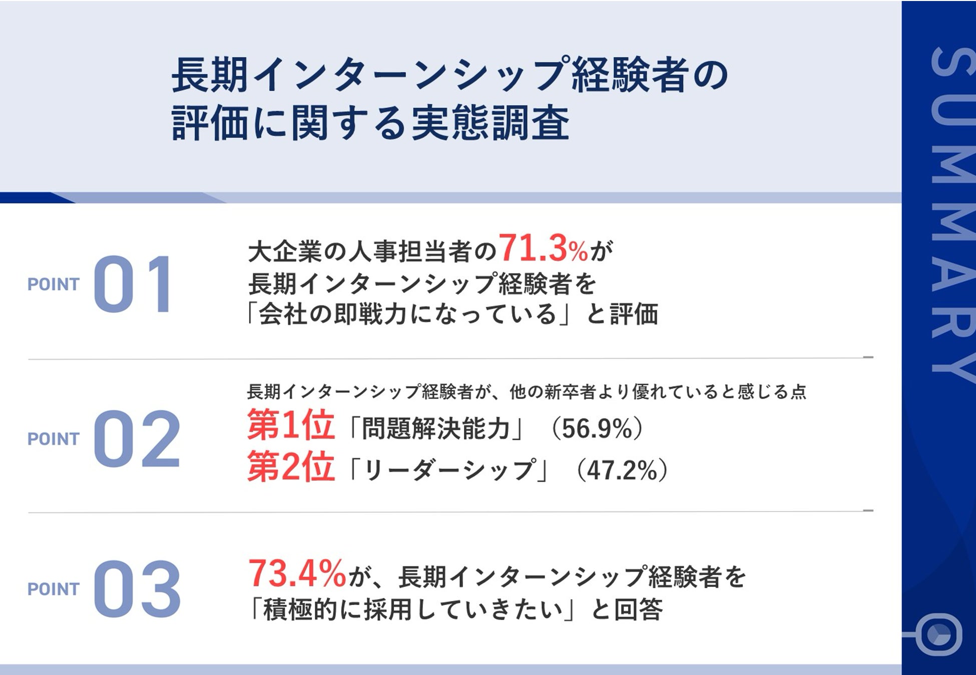 【大企業の人事担当者に調査】約7割が長期インターンシップ経験者を「即戦力」と評価、7割以上が今後も長期インターンシップ経験者を「積極採用」意向