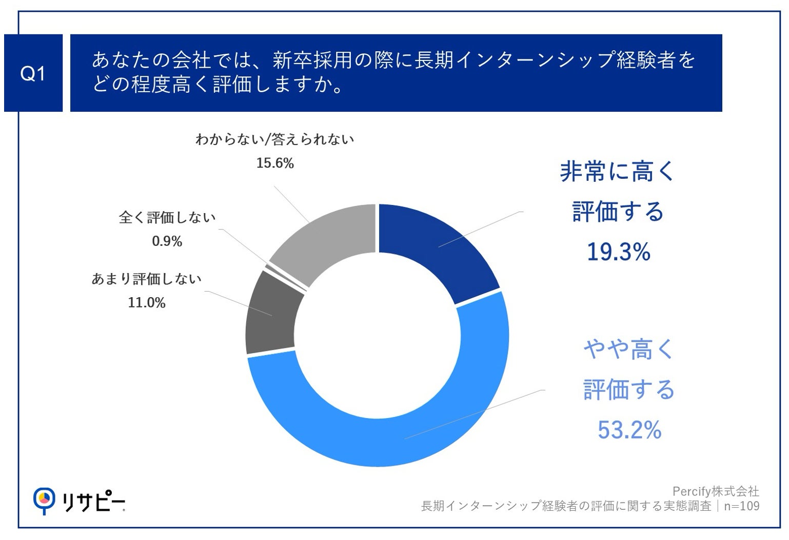 「Q1.あなたの会社では、新卒採用の際に長期インターンシップ経験者をどの程度高く評価しますか。」(n=109)と質問したところ、「非常に高く評価する」が19.3%、「やや高く評価する」が53.2%という回答となりました。