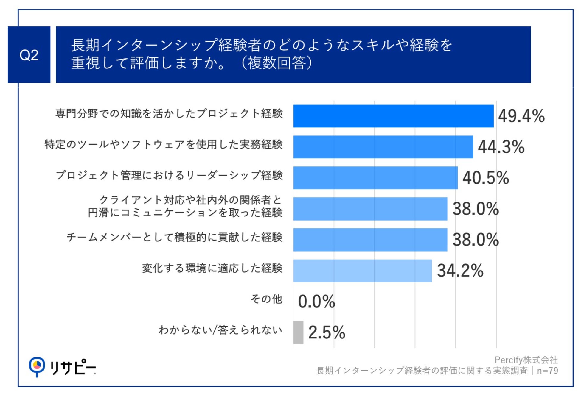 Q1で「非常に高く評価する」「やや高く評価する」と回答した方に、「Q2.長期インターンシップ経験者のどのようなスキルや経験を重視して評価しますか。(複数回答)」(n=79)と質問したところ、「専門分野での知識を活かしたプロジェクト経験」が49.4%、「特定のツールやソフトウェアを使用した実務経験」が44.3%、「プロジェクト管理におけるリーダーシップ経験」が40.5%という回答となりました。