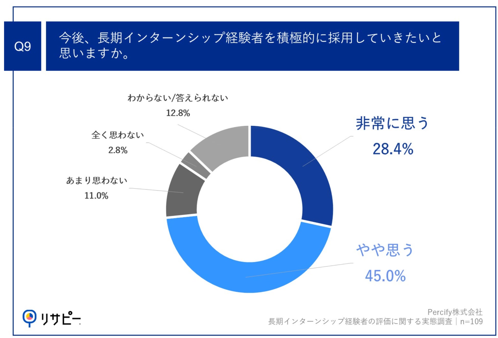 「Q9.今後、長期インターンシップ経験者を積極的に採用していきたいと思いますか。」(n=109)と質問したところ、「非常に思う」が28.4%、「やや思う」が45.0%という回答となりました。