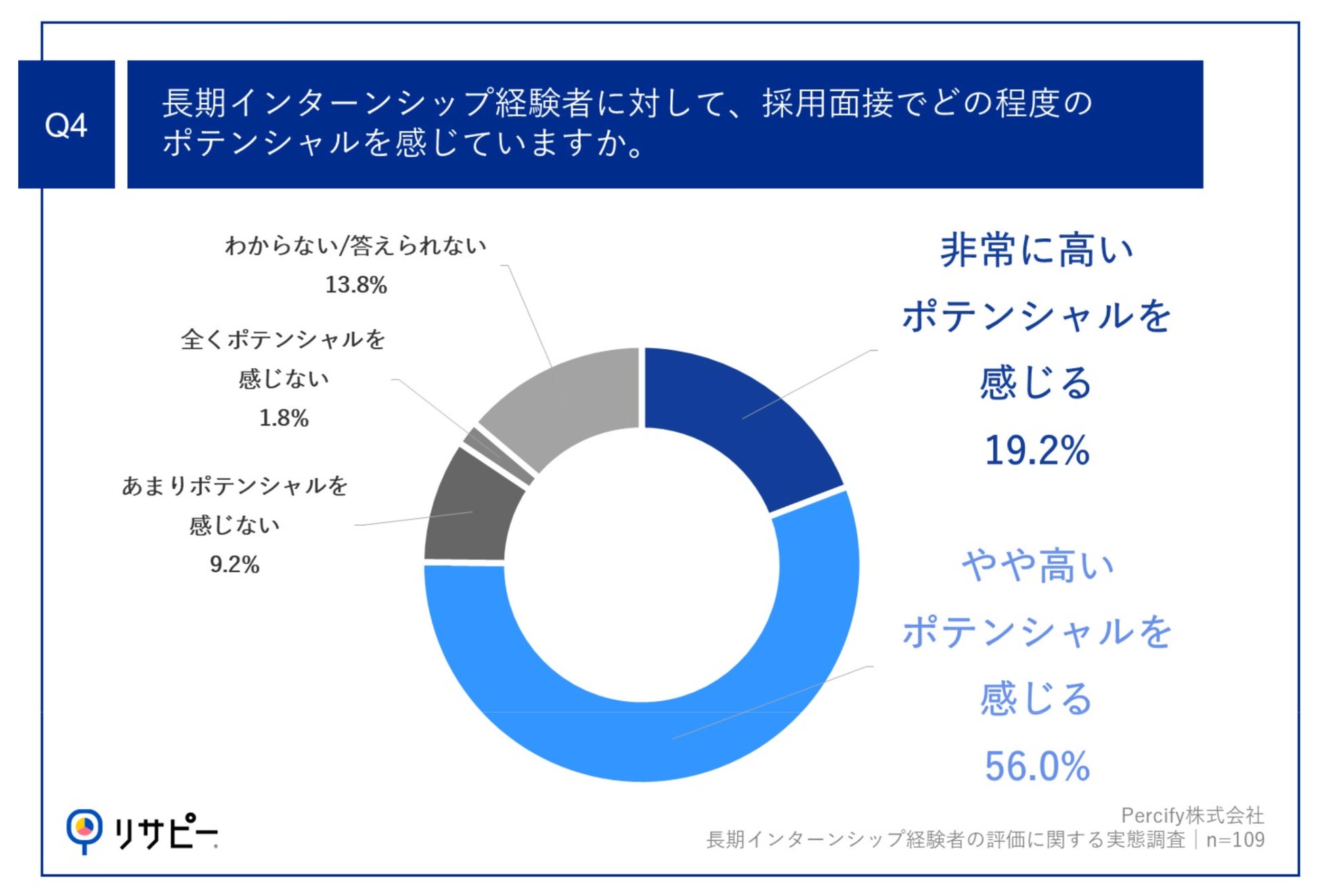 「Q4.長期インターンシップ経験者に対して、採用面接でどの程度のポテンシャルを感じていますか。」(n=109)と質問したところ、「非常に高いポテンシャルを感じる」が19.2%、「やや高いポテンシャルを感じる」が56.0%という回答となりました。