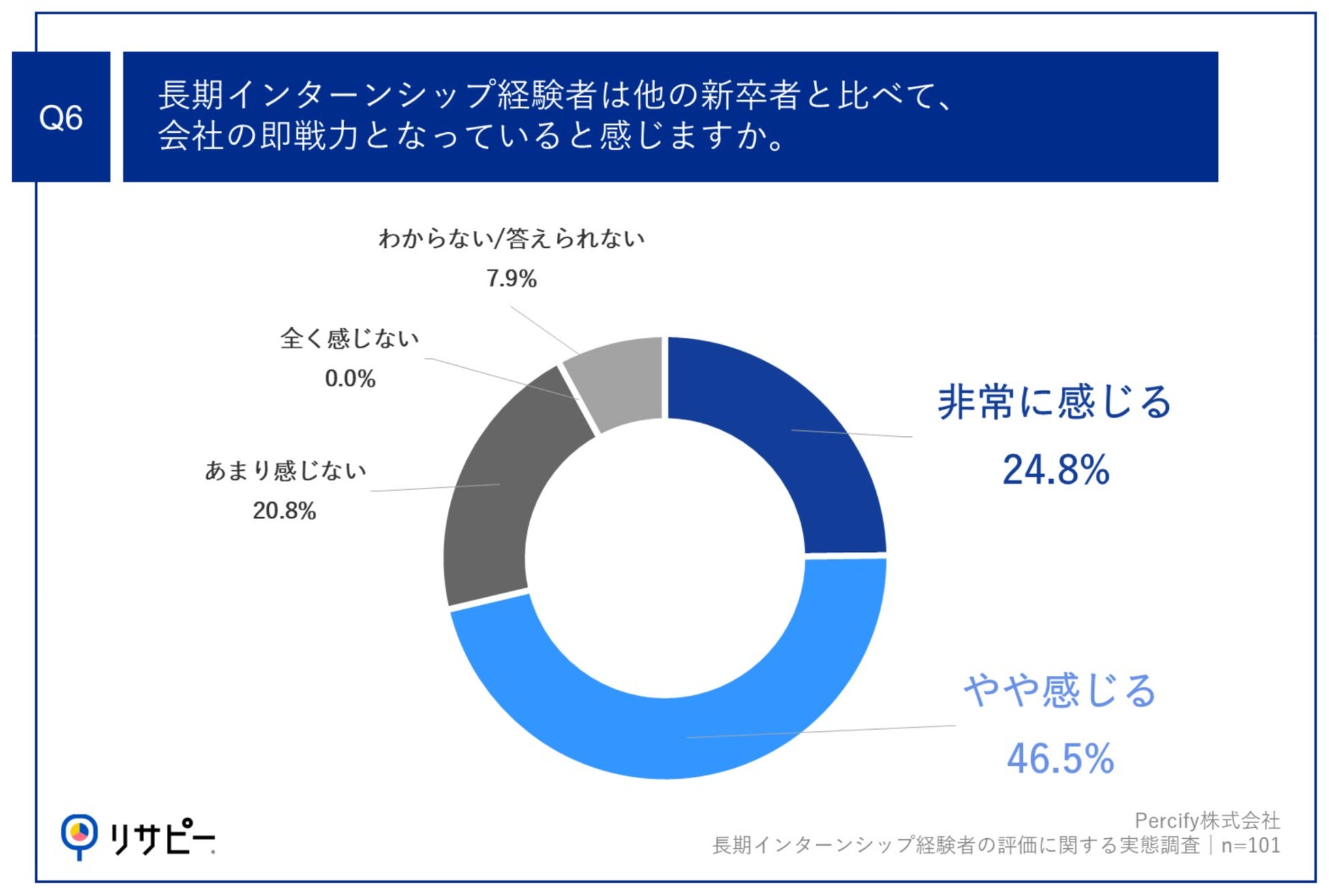 Q5で「長期インターンシップ経験者は採用したことがない」以外を回答した方に、「Q6.長期インターンシップ経験者は他の新卒者と比べて、会社の即戦力となっていると感じますか。」(n=101)と質問したところ、「非常に感じる」が24.8%、「やや感じる」が46.5%という回答となりました。