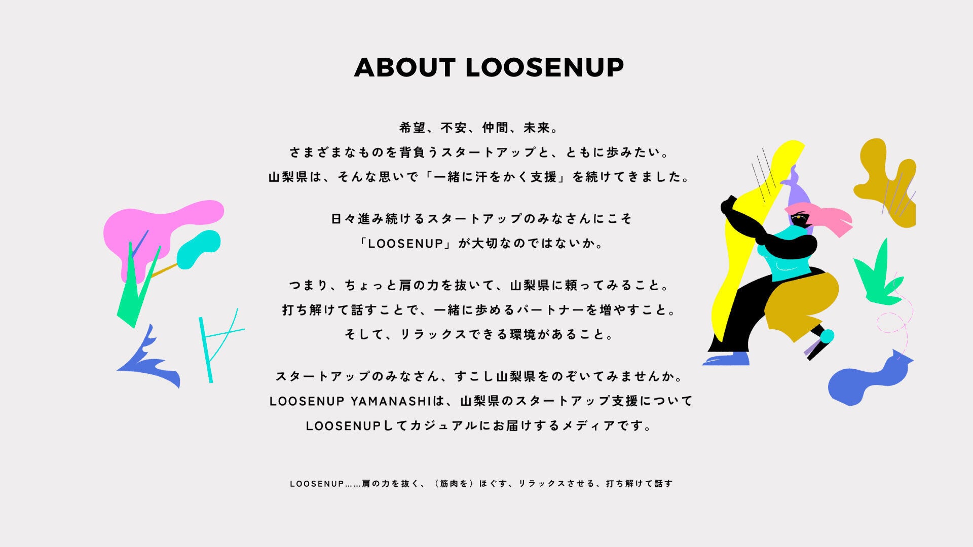 希望、不安、仲間、未来など、さまざまなものを背負い、日々進みつづけるスタートアップのみなさんに、もっと肩の力をぬいて、山梨に頼ってもらえるような関係性をつくりたいという想いから「LOOSENUP」をコンセプトワードとしました。