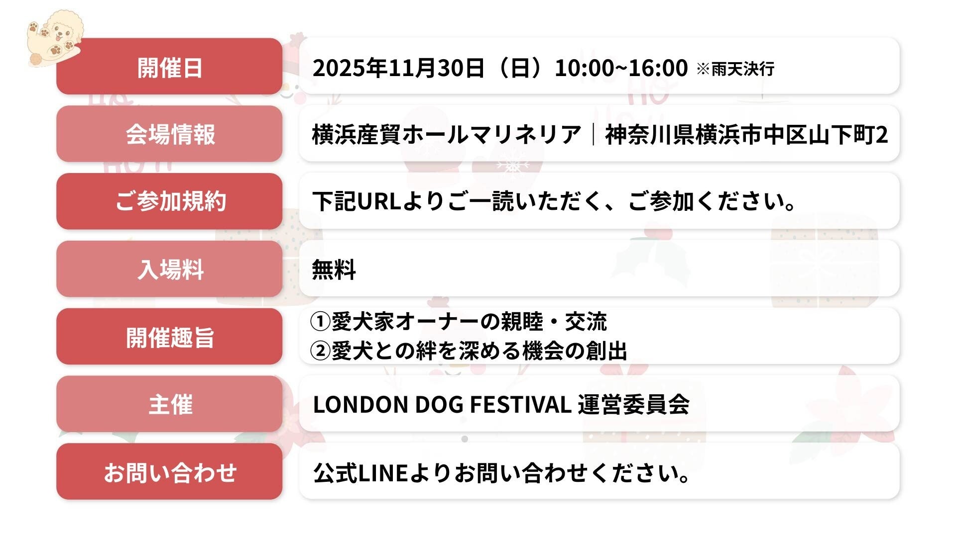 株式会社東京DOGS(本社:埼玉県越谷市、代表:松尾邑仁)は、愛犬と一緒に“秋の横浜”を思い切り楽しむ室内ドッグフェス、 「London Dog Festival YOKOHAMA BRICK & PAWS」を 2025年11月30日(日)、横浜産貿ホール マリネリアにて開催することをお知らせいたします。