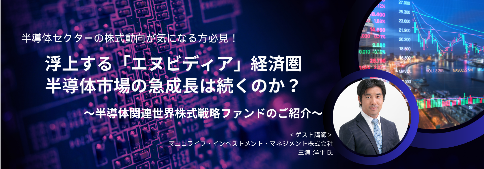 お招きするのは当ファンドの運用を務めるマニュライフ・インベストメント・マネジメント株式会社(日本拠点所在地:東京都千代田区、代表取締役社長:山本真一)のマネージングディレクターを務める三浦 洋平氏。第一線で運用を手掛ける担当者と、当社金融商品部のストラテジストである河西 幸弘による対談形式で当ファンドの魅力を紐解いてゆくとともに、今後の半導体セクターの見通しをお届けいたします。
