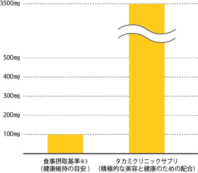 開発にあたり、私たちが何よりもこだわったのは、26年の臨床経験に基づき、日々の美容と健康を支えるために導き出した配合量です。特に、美容と健康の両面で欠かせないビタミンCは、1日の目安量で3,500mg※1 を配合。さらに、ビタミンD・E・B群といった他の主要なビタミンも、国の定める基準を参考に十分な量を配合しました※2。