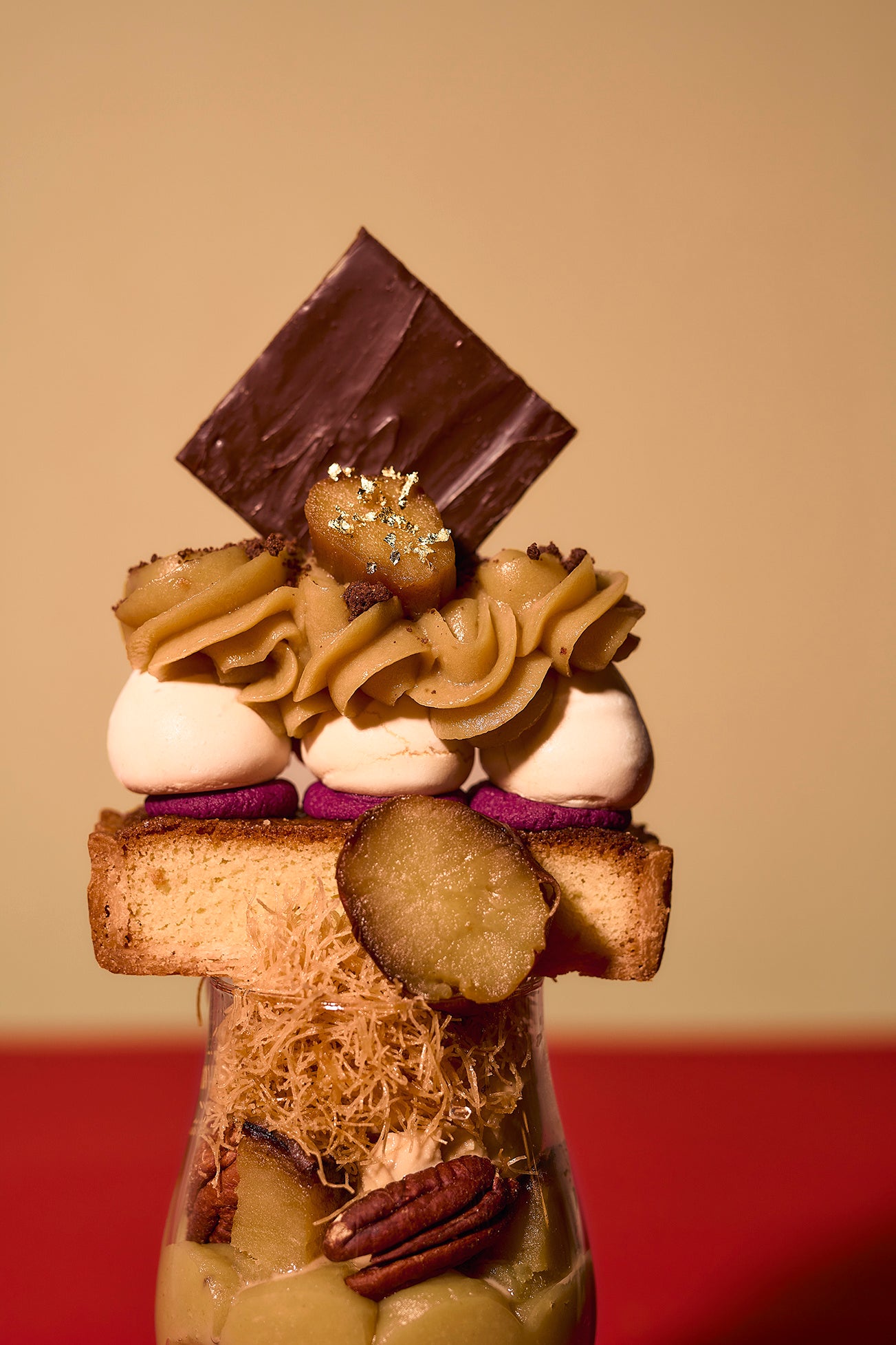 今回のパフェでは、金蜜芋を中心に、チョコレートやナッツ、爽やかなライチとフランボワーズの酸味など、15種の手作りパーツを重ねて構成されています。