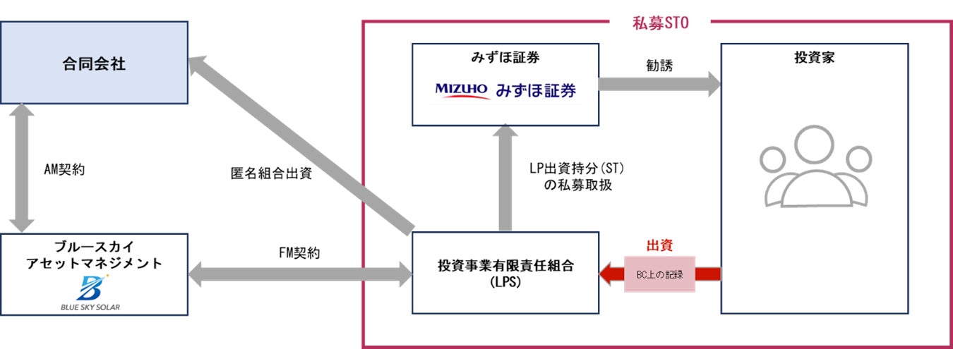 みずほ証券株式会社(取締役社長:浜本 吉郎、以下「みずほ証券」)とブルースカイアセットマネジメント株式会社(代表取締役:窪村 梨絵、以下「ブルースカイアセットマネジメント」)は、太陽光発電施設を投資対象にしたインフラ私募ファンドにおいて、株式会社 BOOSTRY(代表取締役 CEO 佐々木俊典、以下「BOOSTRY 社」)が提供するブロックチェーン基盤 「ibet for Fin」を用い、国内初となる適用除外電子記録移転権利の取り扱い(私募STO※)を行いました。