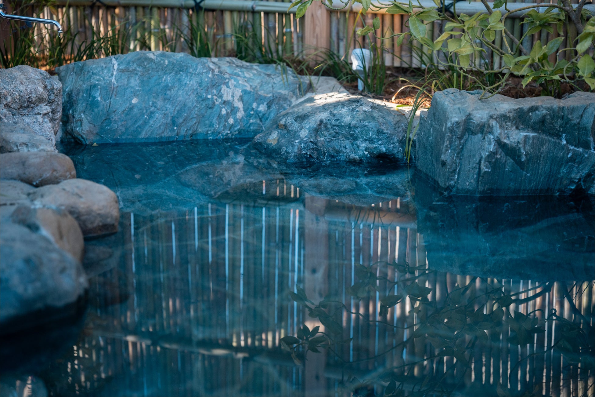 古民家の庭にあった石を集めて作った岩風呂に、井戸水を掛け流して水風呂にしています。
