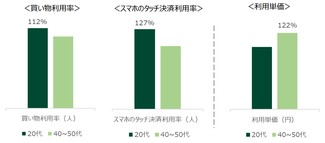 Oliveにおけるキャッシュレス決済のご利用状況について、20代と40~50代を抜粋して比較すると、20代の方が全体の利用率やスマホのタッチ決済の利用率は高いものの、決済利用単価では40~50代の方が高い傾向がみえています。