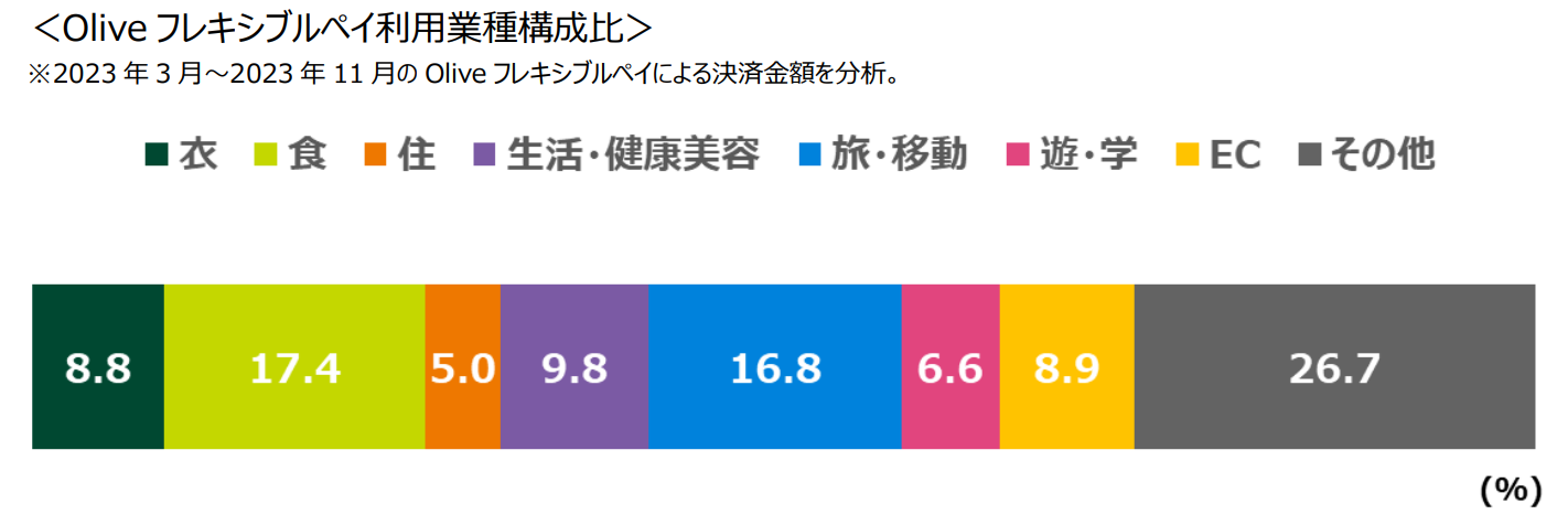 Oliveフレキシブルペイで決済されている業種をみると、「食」の割合が最も高く、「旅・移動」、「生活・健康美容」、「EC」と続きます。日常利用だけでなく旅行やECなどを含む幅広い業種でご利用いただいております。