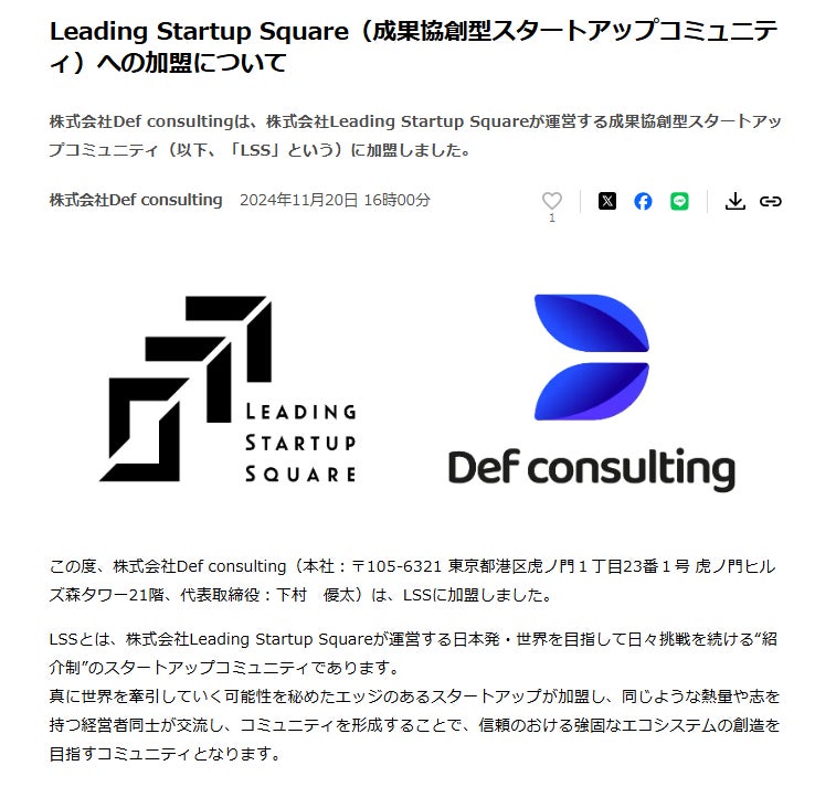 この度、上場企業である株式会社Def Consulting[東証グロース](本社:〒105-6321 東京都港区虎ノ門1丁目23番1号 虎ノ門ヒルズ森タワー21階、代表取締役:下村 優太)がLeading Startup Square(本社:〒135-0061 東京都江東区豊洲三丁目2番24号 豊洲フォレシア10階、代表取締役:御幡 勇気)に入会の旨、プレスリリース発表後(2024年11月20日 16時00分配信)、株式会社Def Consulting[東証グロース]の株価が37%上昇するという素晴らしい成果が報告されましたことを、ご報告申し上げます。