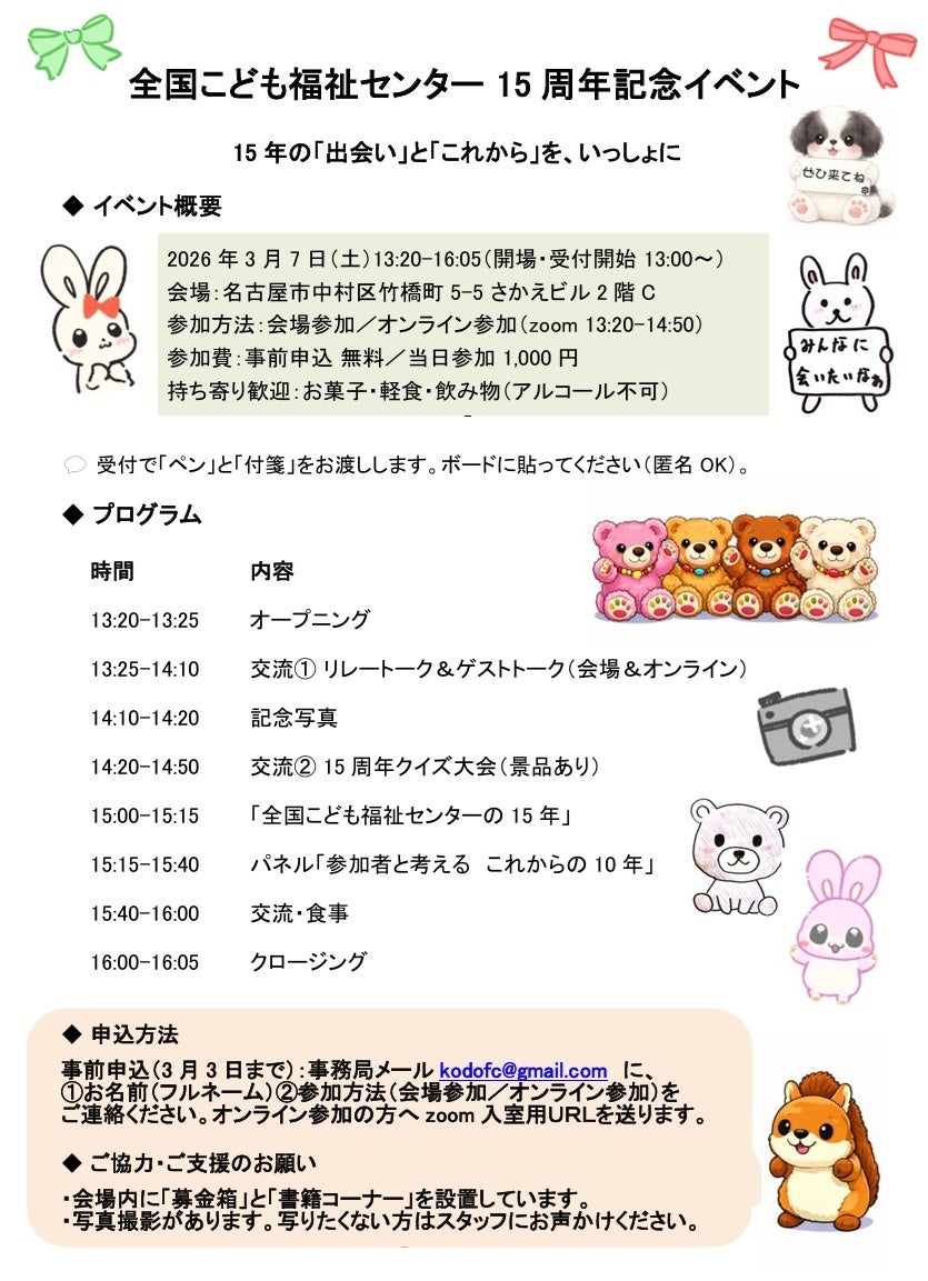 特定非営利活動法人全国こども福祉センター(名古屋市)は、設立15周年を記念し、2026年3月7日(土)に初の記念イベントを開催します。会場参加とオンライン参加をつなぎ、交流と対話を中心に据えた参加型イベントです。全国から参加者が集います。