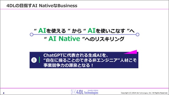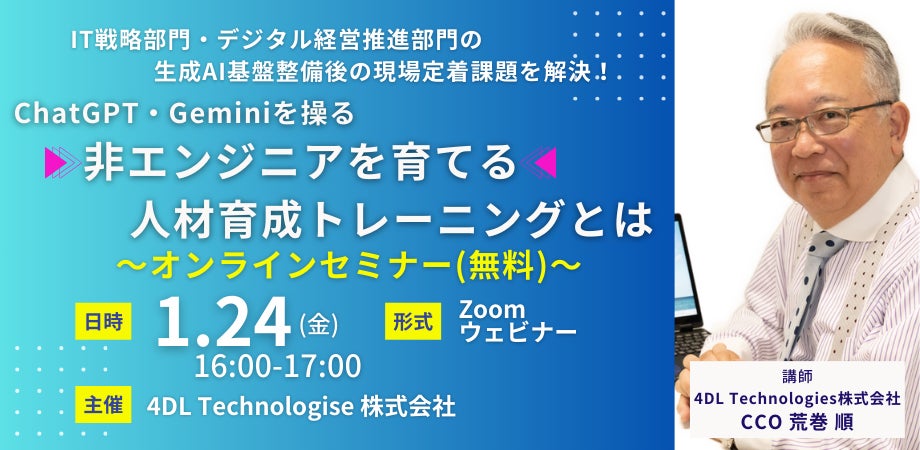 4DL Technologies 株式会社(本社:千葉県千葉市、代表取締役CEO兼CTO:荒巻 智隼、以下「4DL」)は、2024年10月にローンチした《非エンジニア向けに実務でChatGPTやGeminiを活用するための実践型リスキリングプログラム【ANT-B1】》をアップデートし2025年4月より提供をはじめます。