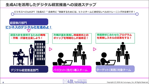 生成AIは自然言語処理技術(NLP)という仕組みのため、日常会話の延長線上で利用することができるという今までのIT技術とは比較にならないほどの「利用障壁の低さ」が特徴です。しかし、逆な見方をすると4DLはその特徴が「行き当たりばったりに使う」という結果を生みだしているのも事実だと考えています。