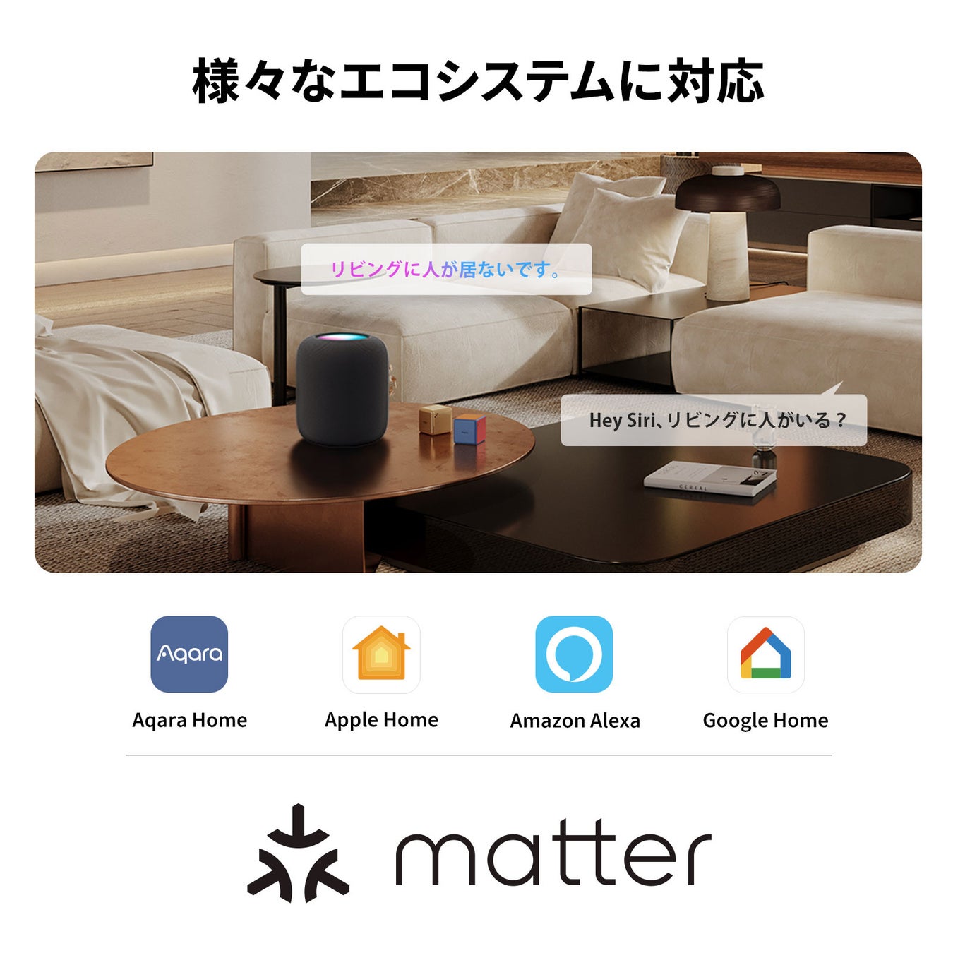 人感センサーFP1Eは、AqaraのZigbeeハブ(M2ハブとスマートカメラG3ハブ)を経由してMatterに対応可能、Apple Home、Amazon Alexa、Google Home、Samsung SmartThings、Home Assistantなどの主要エコシステムとシームレスに統合できます。
