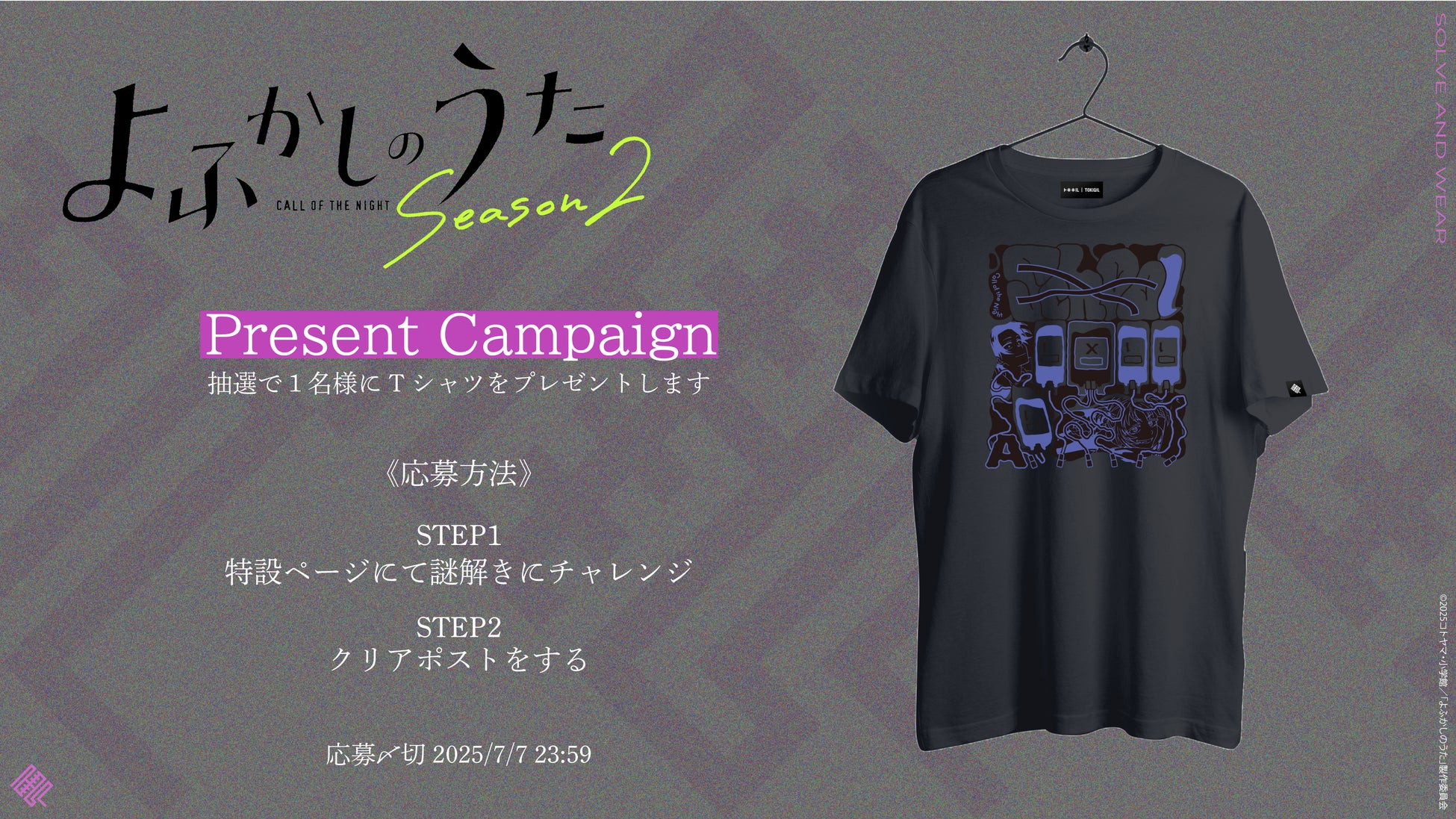 商品はTシャツとナップサックの全2種。いずれもTVアニメ『よふかしのうた』をモチーフとした暗号が仕込まれており、暗号を解き明かすことで初めて購入する権利を手に入れることができます。