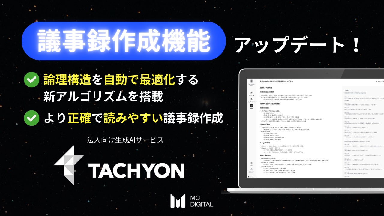 テクノロジーをもって企業の課題解決を支援するエムシーデジタル株式会社(本社:東京都千代田区、代表取締役社長:河内 伸学)は、同社が開発を進めるGPT/Gemini/Claudeの複数LLM利用が可能な法人向け生成AIサービス「Tachyon 生成AI」において、音声・動画データから議事録を自動作成する機能のアップデートを実施しました。今回のアップデートでは、生成される議事録の品質向上と、編集機能の強化を行いました。これにより、より正確で読みやすく、そして編集しやすい議事録作成を可能とし、企業の生産性向上に貢献します。