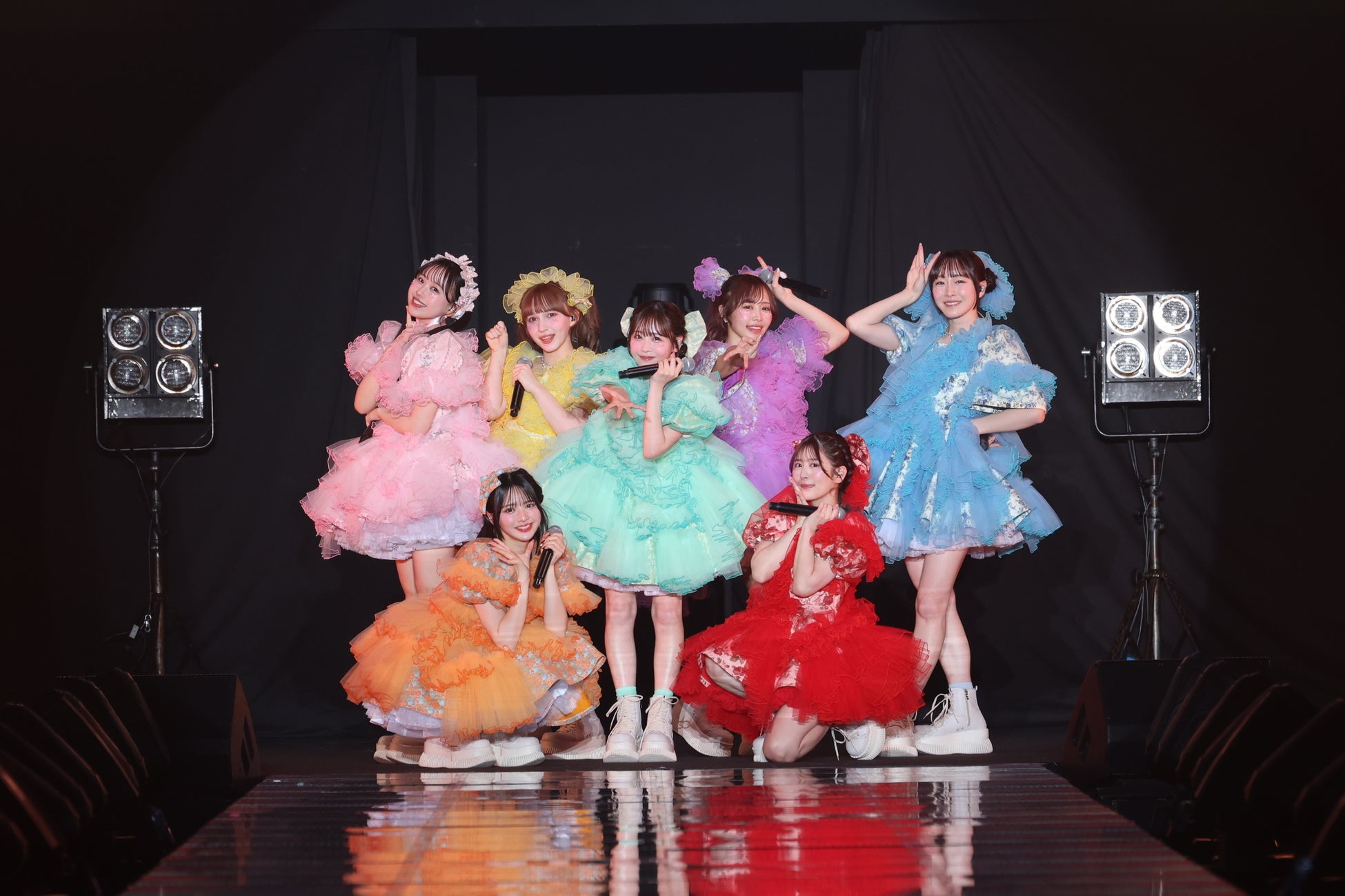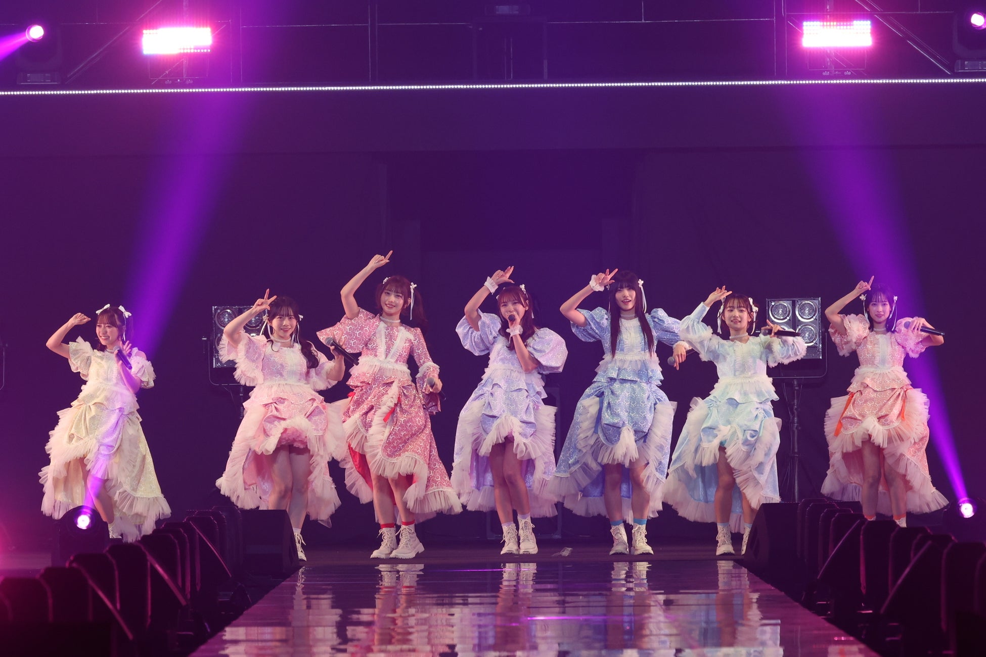 雨を表現したステージでは、レースやリボンを全身に纏い、傘を持った桜庭遥花(CUTIE STREET)が登場。続いて、逃げ水あむ(きゅるりんってしてみて)、月深乃絢(AVAM)、松本ももな(高嶺のなでしこ)、櫻井もも(≠ME)がステージを彩りました。