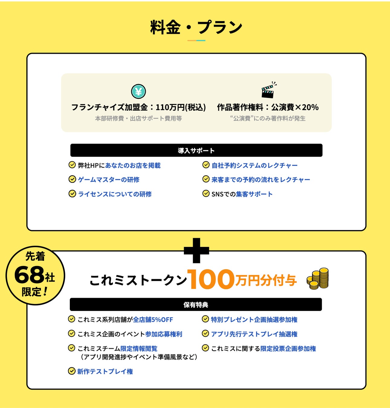 「間借りでマーダー」のフランチャイズ加盟に関しては、先着68社限定でFiNANCiEのプラットフォームを通じて募集を行います。この期間中にお申し込みいただいた加盟店には、FiNANCiEにて発行される「これミストークン」100万円分が付与される特別な条件をご用意しております。