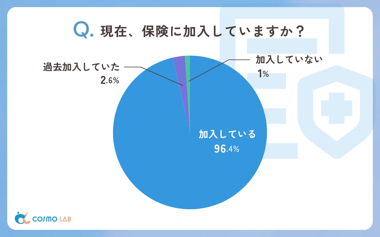 96.4%が「加入している」と回答しており、シニア層における保険加入が一般的である状況を明確に示しています。未加入者や過去加入者は3.6%と少数にとどまっていますが、この層には特定のライフスタイルや価値観があると考えられます。