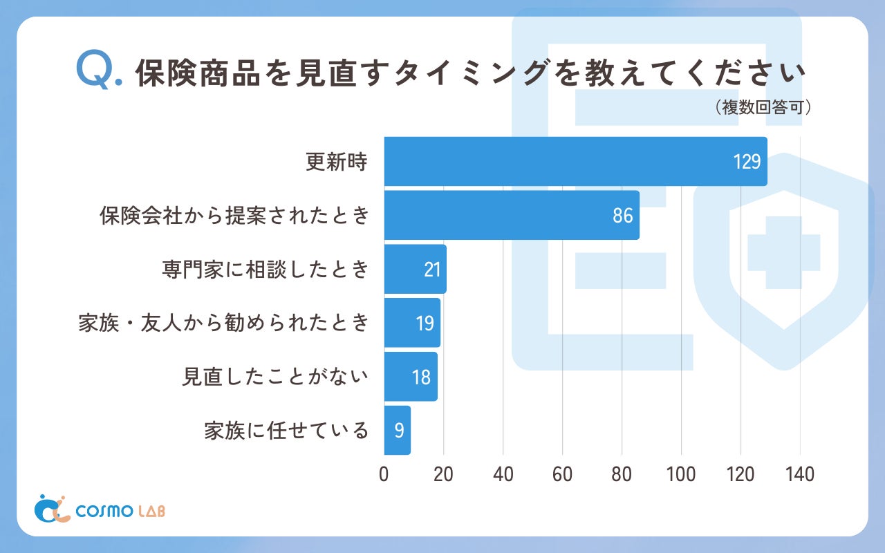 69.0%の回答者が「更新時」に保険を見直すと回答しており、これが最も重要な機会となっています。「保険会社から提案されたとき」(46.0%)も有効なタイミングとして認識されており、保険会社からの能動的なアプローチが契約更新や新規契約の促進に寄与することが分かります。