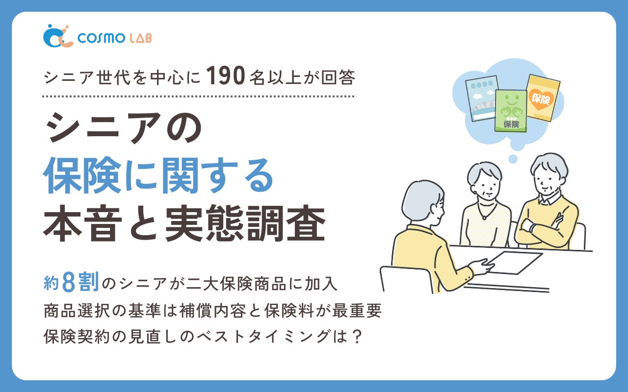 シニア専門の調査プラットホーム コスモラボ (会社名:コスモヘルス株式会社、本社:東京都港区、代表取締役社長 小塚 崇史)が保険に関する市場調査・アンケートリサーチのレポートをリリースいたしました。