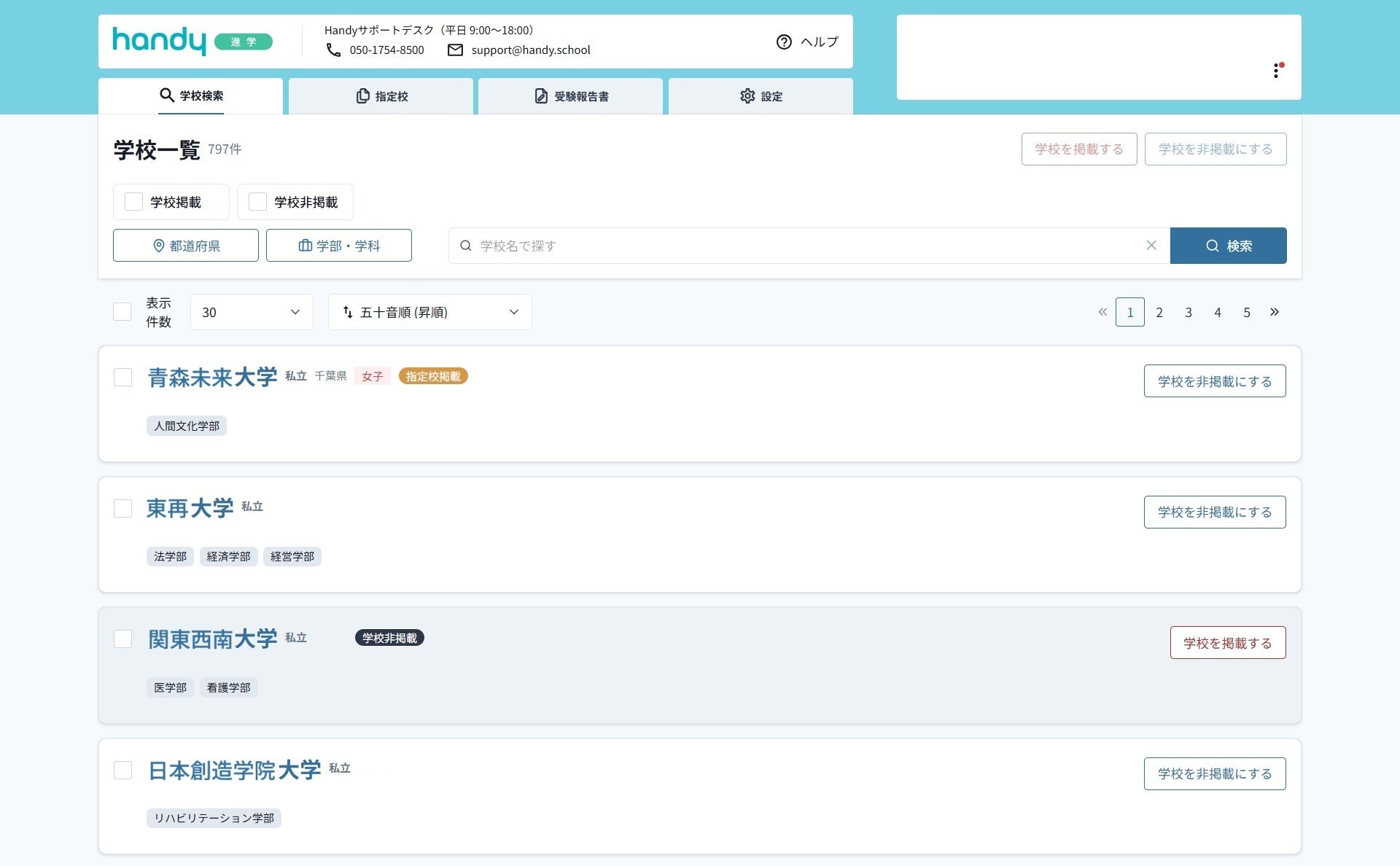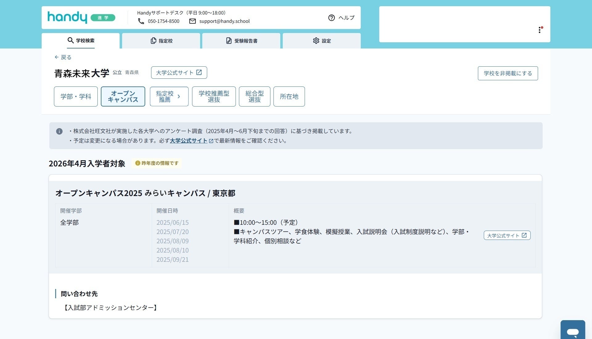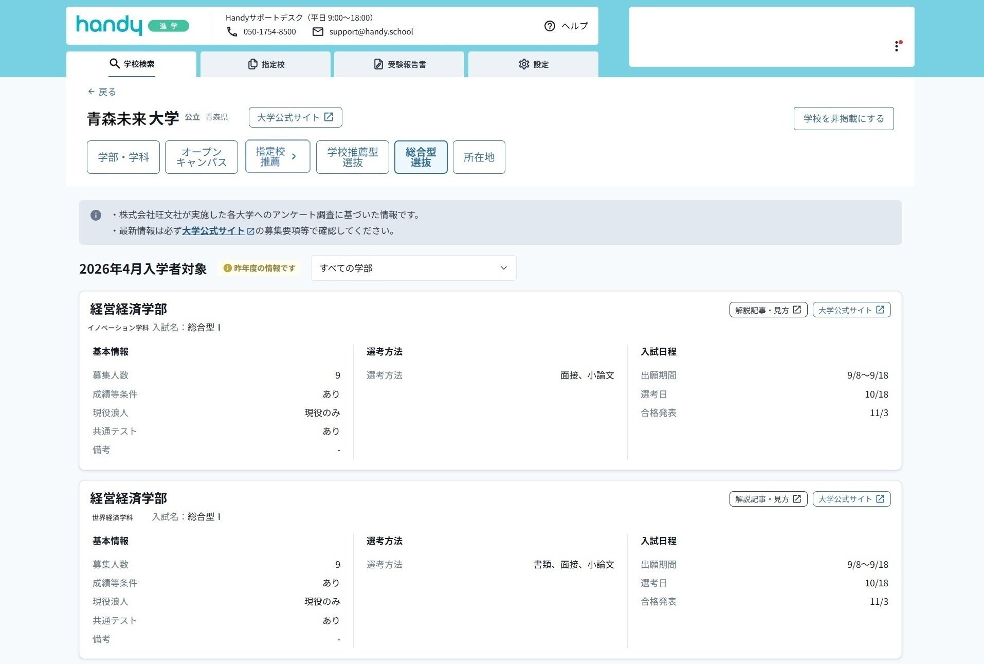 本サービスは継続的な機能拡充を予定しており、今夏を目処に「一般選抜」に関する入試情報の追加掲載を計画しております。これにより、指定校推薦やその他の年内入試にとどまらず、一般選抜に至るまで年間を通じたあらゆる入試情報をHandy上で網羅的に検索・管理できる環境を実現し、生徒の多様な進路選択をさらに強力にサポートしてまいります。