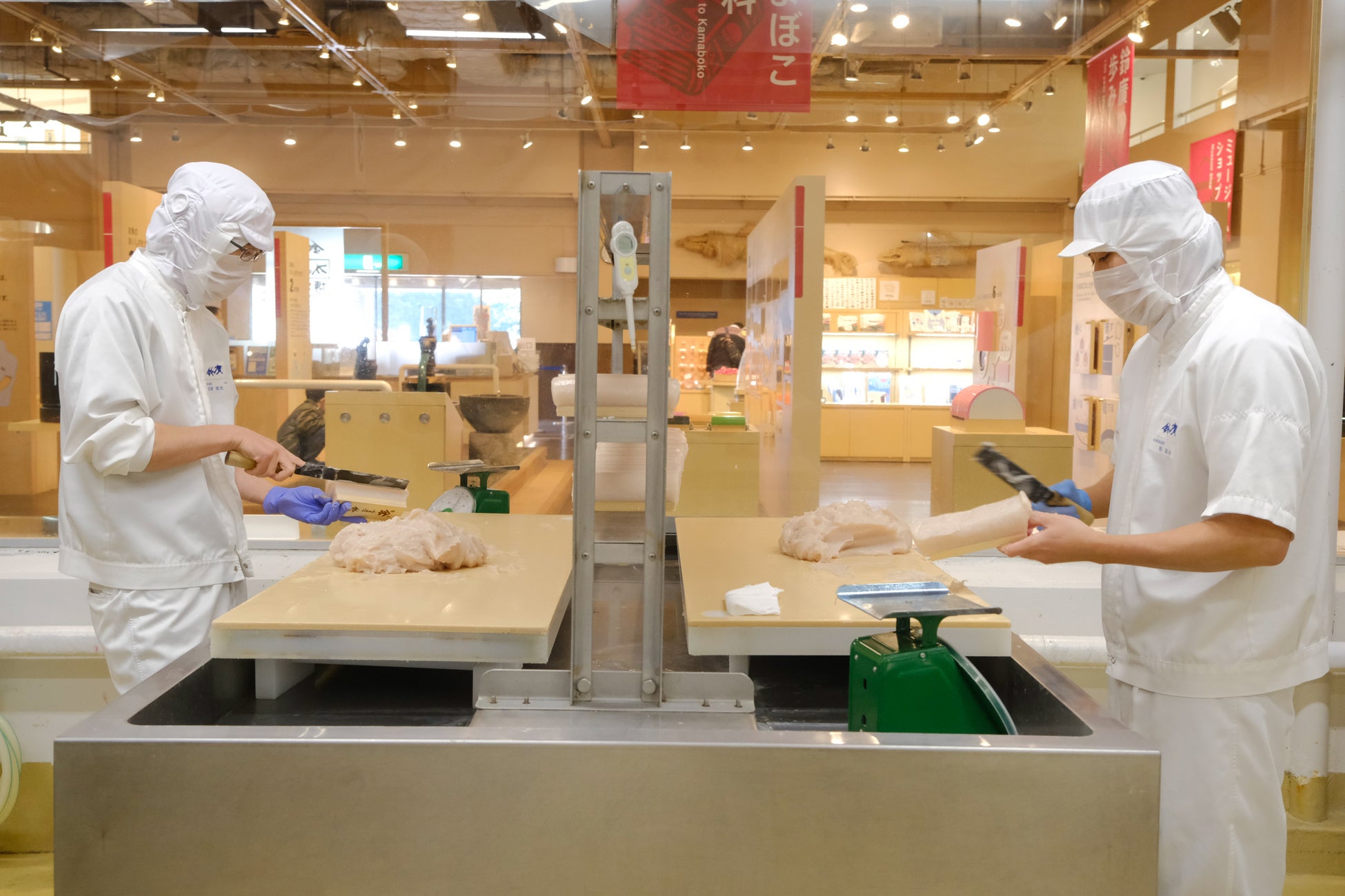 国家資格「水産練り製品製造技能士一級」の資格を持つかまぼこ職人たちが、通常のかまぼこの2倍の大きさもある「一」を、2~3日に渡り1本1本手作業で作り上げます。職人が「一」を作る様子は、「鈴廣かまぼこ博物館」でご覧いただけます。この様子は年に一度、数日間しか見られない光景です。かまぼこ博物館を訪れるお客様の中には、「見事な手業に思わず見入ってしまった」というお声も。