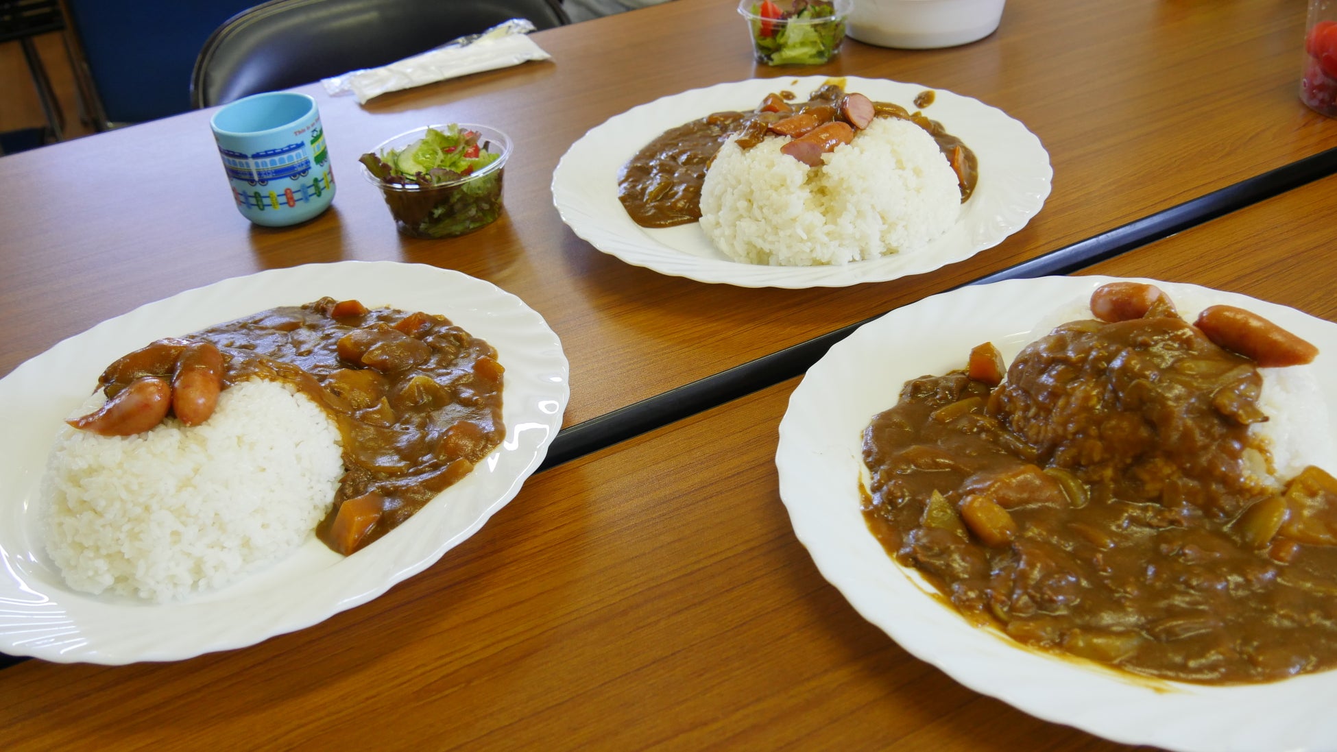 昼食は40名全員で賑やかに囲まれ、岡田選手による力強い「いただきます」の号令で始まった。具沢山のビーフカレーと色鮮やかなサラダが食卓に並び、カレーはおかわりも続出した。
