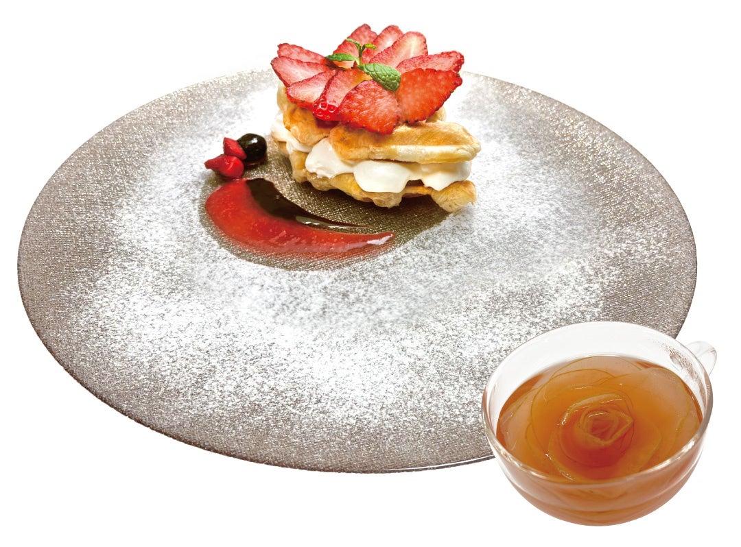 甘味と酸味のバランスが絶妙の静岡県産の紅ほっぺを使用し、クリームをクロッフルではさみ、ケーキのように仕上げました。別添えのチョコやいちごソースもつけるとアクセントに!花びらをイメージしたアップルティーもお楽しみください。 ※写真はアップルティーセット