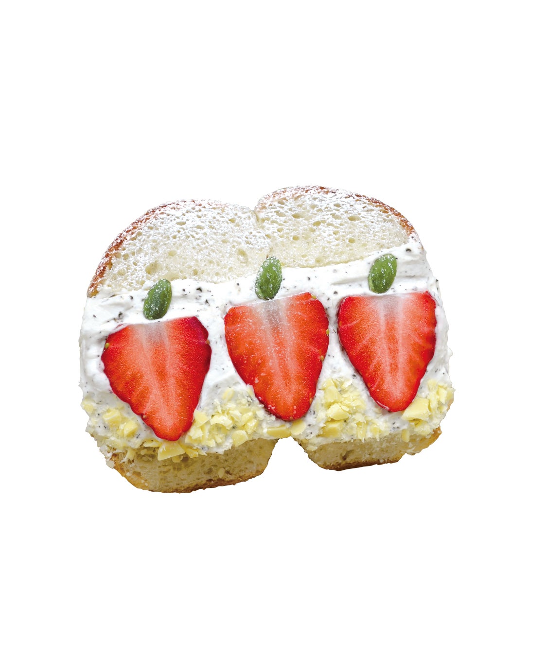 断面がいちごに見えて思わず写真を撮りたくなる一品。三島産の紅ほっぺLサイズを使用、米粉のベーグルにアールグレイの茶葉とサワークリームでさっぱりと仕上げたベーグルサンドです。