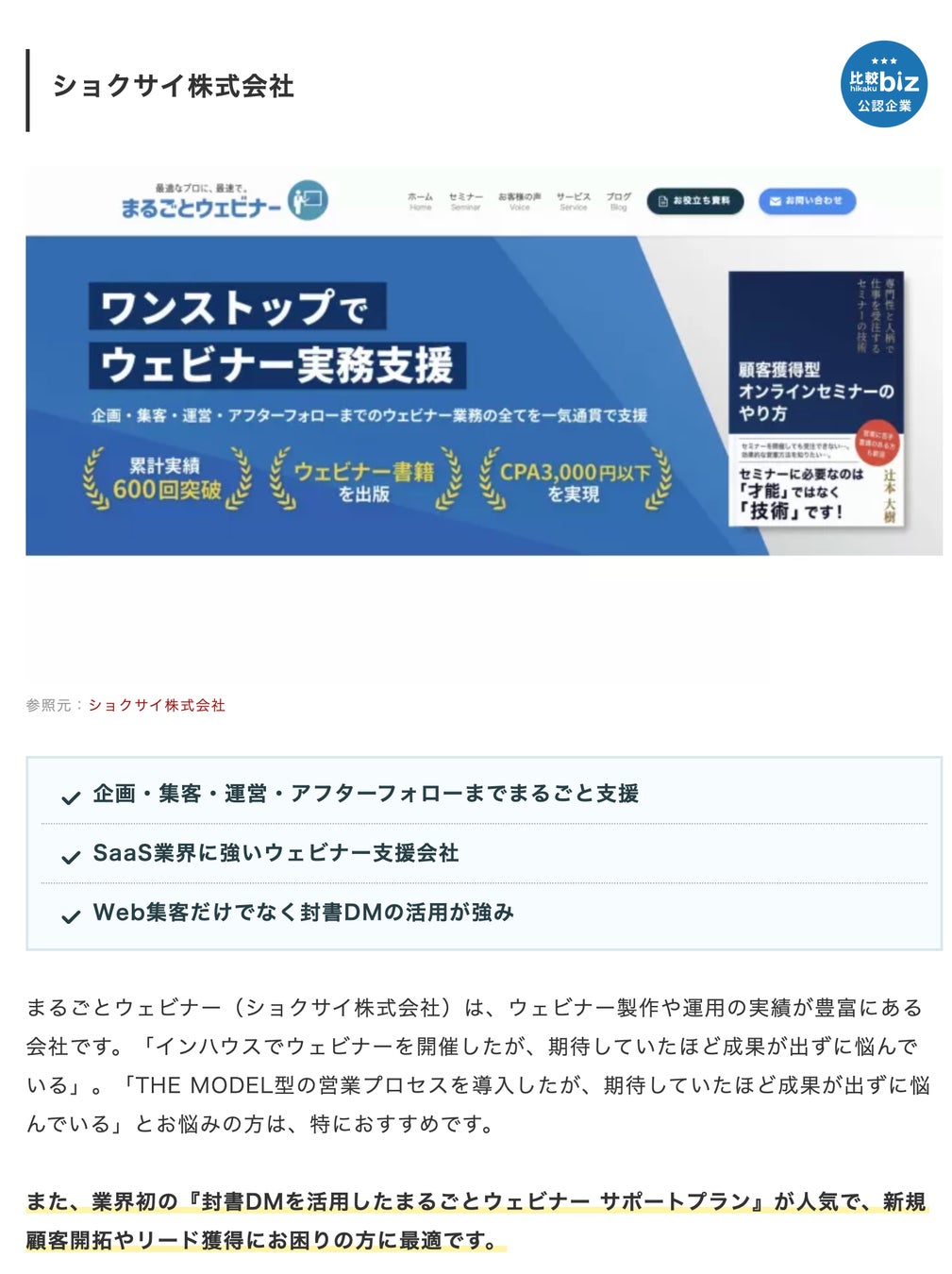 日本最大級のビジネスマッチングサイト「比較ビズ」にまるごとウェビナーがご紹介いただきました
