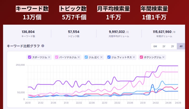 コロナが明けてから全体的に検索量が伸びています。特に、パーソナルジムへの関心が高まっています。