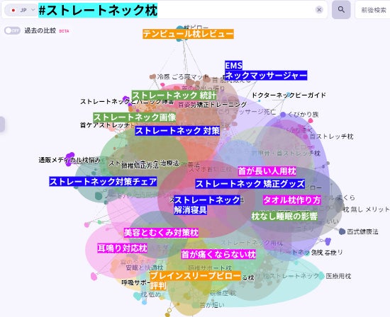 ストレートネックの改善方法を求めているユーザー群と、ストレートネックに悩むユーザーが求めている枕の種類についての情報を求めるユーザー群がいることが分かります。