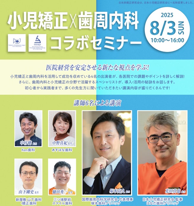 本セミナーでは、小児矯正および歯周内科の活用によって医院経営の成功を実現している現役歯科医師による症例・導入事例を多数紹介。初心者から実践者まで、多くの歯科医師・スタッフに役立つ実践的な内容をお届けいたします。