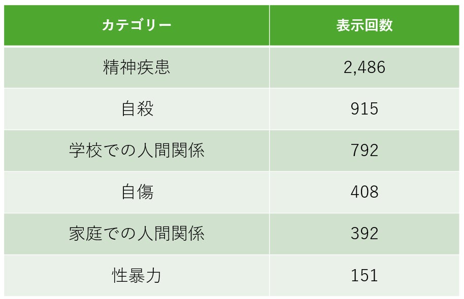 カテゴリー別に見ると、「精神疾患」の表示回数が全体の約48%(2486)を占め、続いて「自殺」が約18%(915)、「学校での人間関係」が約15%(792)となりました。