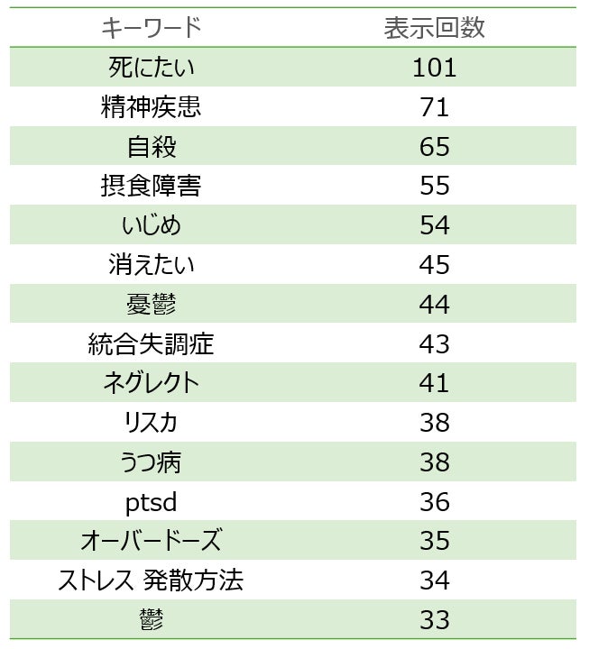 キーワード別では、「死にたい」「精神疾患」「自殺」「摂食障害」「いじめ」といった言葉が多く検索されていることが分かります。詳細は下記の表をご参照ください。