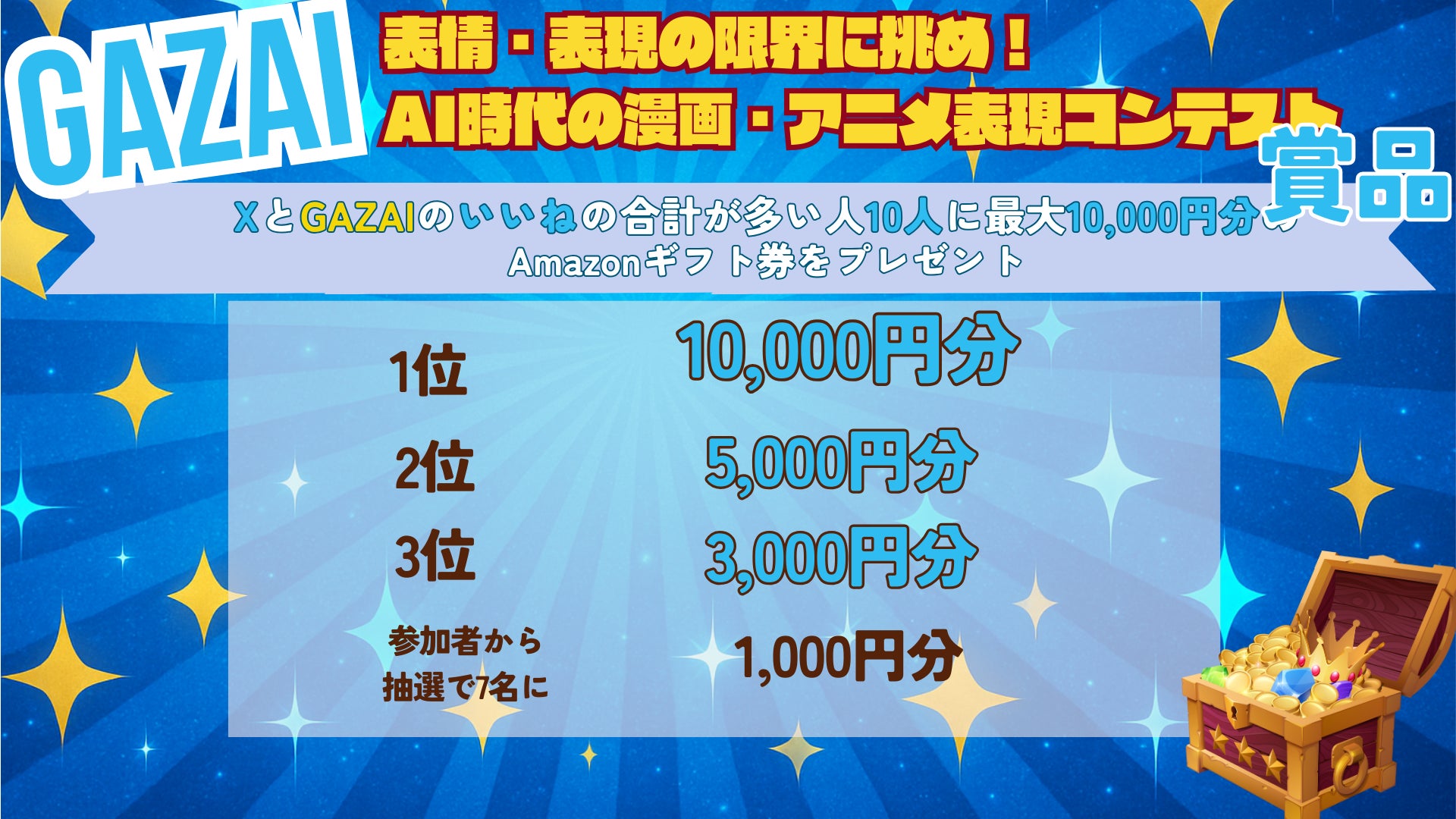 X(旧称:Twitter)の「いいね」数 と GAZAI内の「いいね」数の合算で順位をつけ、多い人が優勝となります。更に投稿した人の中から抽選で7名様に1,000円分のAmazonギフト券をプレゼント致します。