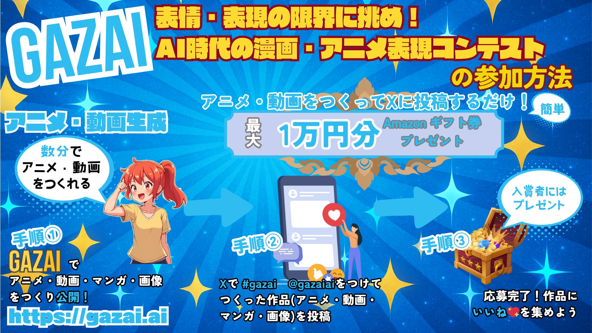 株式会社GAZAI(本社:東京都渋谷区、代表取締役:一岡亮大、以下「当社」)は、生成AIプラットフォーム「GAZAI」(https://gazai.ai/)にて、4/23(水)11:00から5/7(水)23:59迄、新機能「変顔メーカー」「アニメ生成」を活用してAI時代の漫画・アニメ表現コンテストを実施致します。