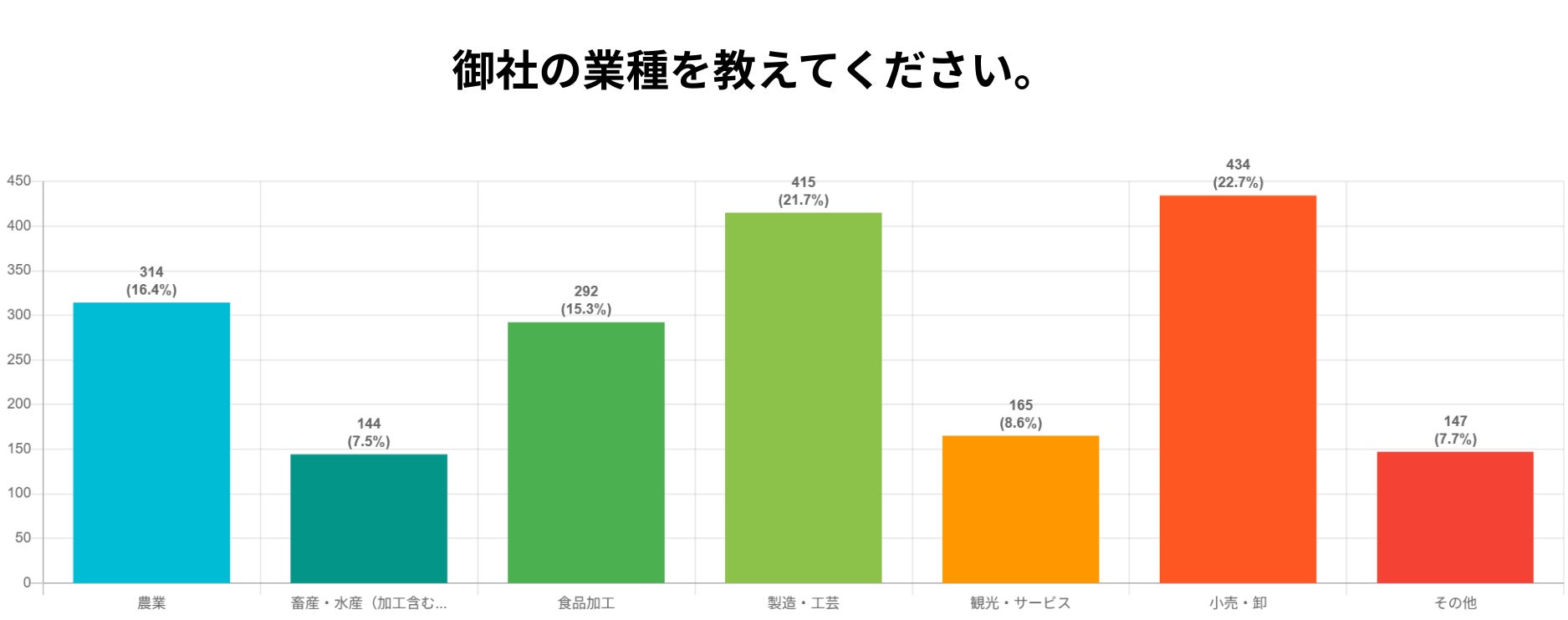 小売・卸(22.7%)、製造・工芸(21.7%)、農業(16.4%)、食品加工(15.3%)など。 一次産業から観光サービスまで、地域経済の多様なプレイヤーが回答しています。