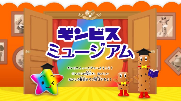 また、ギンビスの歴史などを紹介する「ギンビスミュージアム」を博物館のようなデザインに変更し、ふりがなのオン・オフ機能を追加しました。子どもから大人まで楽しみながら、ギンビスをより知っていただける工夫を施しています。