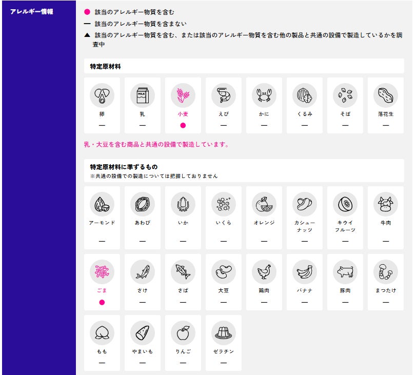 また、商品ごとの詳細情報を1ページにまとめ、アレルゲン情報は食物アレルギー表示推奨品目を含めより詳細に28品目を表示し、安心してお菓子をお召し上がりいただけるようにいたしました。