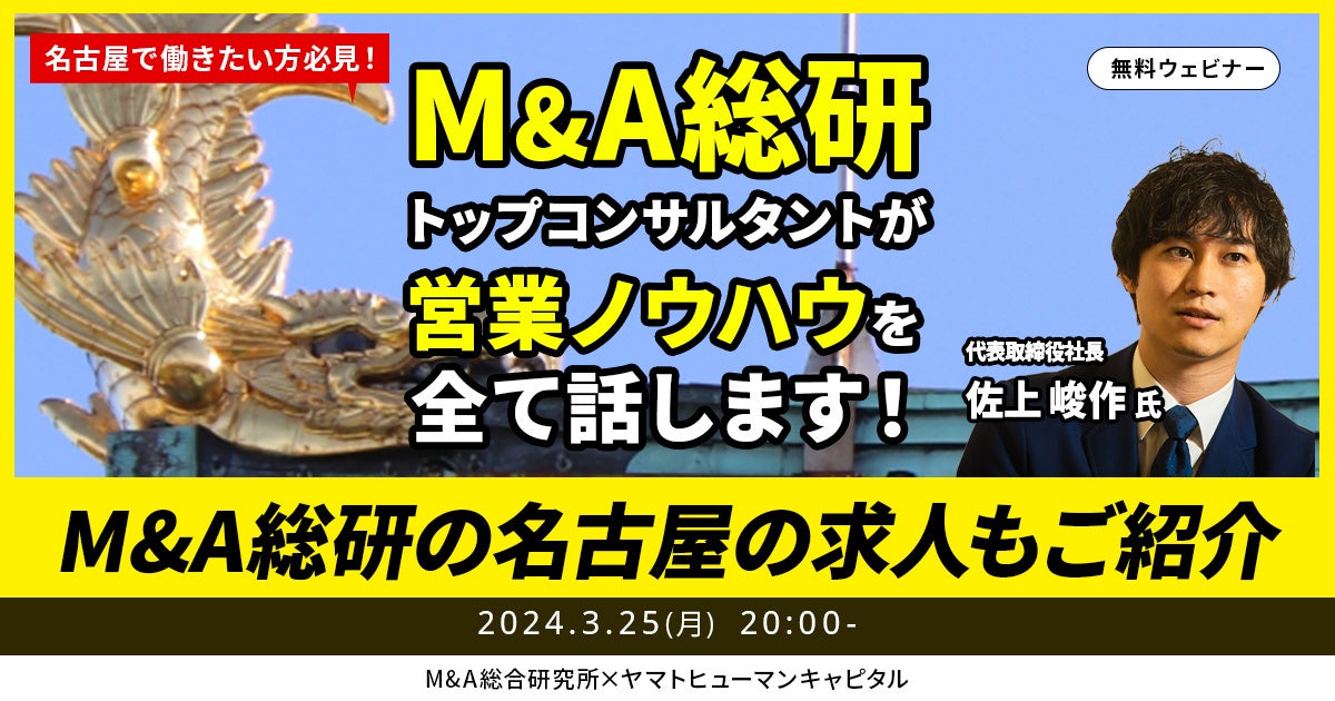 ヤマトヒューマンキャピタル株式会社(本社:東京都千代田区、代表取締役:堀江 大介)は、2024年3月25日(月)20:00よりオンラインにて、株式会社M&A総合研究所代表取締役社長佐上峻作氏にご登壇いただくウェビナー『M&A総研トップコンサルタントが営業ノウハウを全て話します!』を開催いたします。