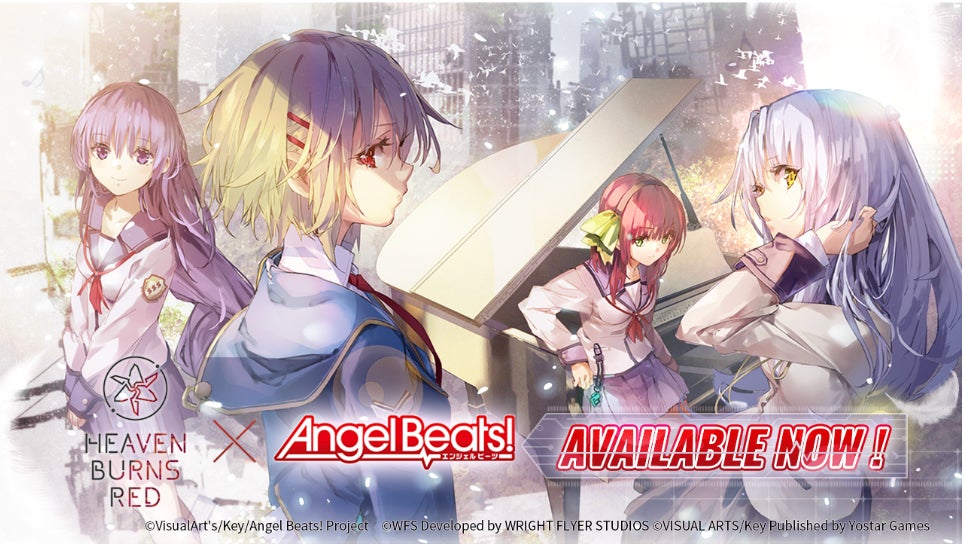 株式会社WFS(本社:東京都港区、代表取締役社長:柳原 陽太、グリーホールディングス株式会社100%子会社)は、自社のゲームブランド「ライトフライヤースタジオ」と、株式会社ビジュアルアーツ(本社:大阪府大阪市、代表取締役:天雲 玄樹)が手がける、Yostar Gamesから好評配信中のドラマチックRPGの英語版『Heaven Burns Red』において、サービス開始180日を記念した「Key」を代表するテレビアニメ『Angel Beats!』とのコラボイベントを2025年5月16日(金)より開催することをお知らせします。