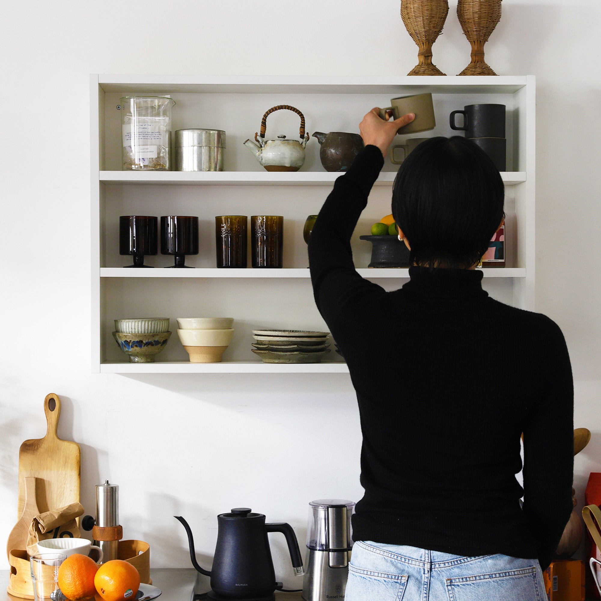 「レギュラーシェルフ」は、キッチンやダイニング、リビングに設置しやすい壁付け収納棚です。奥行き14.5cmの浅さは、コーヒーの道具やカップ、調味料、小皿などがぴったりフィット。日常使いのアイテムを横一列に並べることで、見た目にも美しく、使いやすさも考慮した収納です。