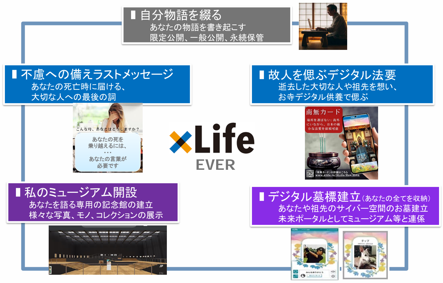 人生を歩み存在した証として、そして出会った感謝として、この大切な人達へ「想いと自分物語」をデジタル技術で時間を超えてきちんと届ける、一般社団法人ライフDX推進協会(以下、当協会)「xLifeサポートプログラム EVER」の夢です。
