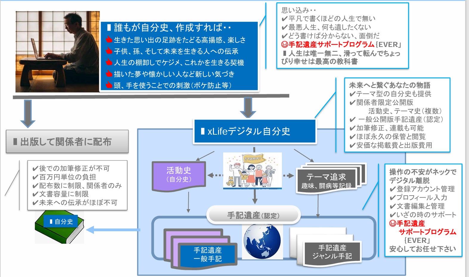 当協会が運営する人生デジタル化SNS「xLife(エクスライフ、クロスライフ)」で実現しようとしているサポートプログラムEVERの狙いです。