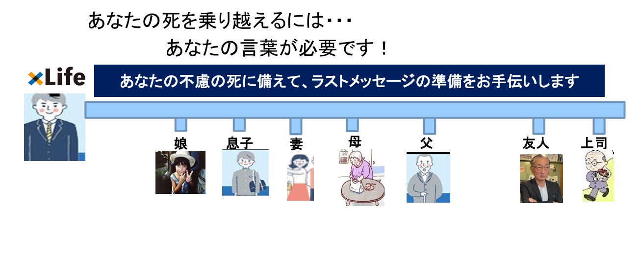 あなたの不慮の死亡に備えて大切な人へ事前に作成したメッセージを確実に届けたるデジタルサービスです。老若男女、誕生日は大切な人を想い感謝しつつラストメッセージを作成する(更新する)日として広めていきたいと考えています。